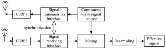 The signal received by the antenna passes through the RF front end, the Analog-to-Digital Converter (ADC) module and the FPGA module in the USRP2 sequentially, and finally becomes the digital baseband signal. At the same time, the signal transceiver interface realizes synchronization of continuous wave radar transmission and reception to remove the delay of the device. The transmit and receive signals after synchronization are mixed to filter out the high frequency carrier. Eventually, the signal reduces data redundancy by resampling, and obtains an effective signal for adapting to PC-side data processing.