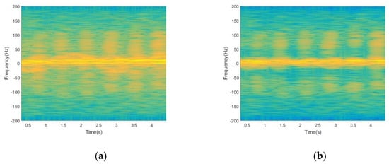 The time-frequency distributions of the raw signal before and after using EMD processing is shown in Figure 3. As shown in Figure 3a, the interference signal aliases with the signal of target human motions, making the signals hard to use to identify target human motions. It can be seen obviously from Figure 3b that after using EMD processing, most of the non-target micro-motion interferences are filtered out, while other useful components are retained. However, the time-frequency resolution of time-frequency distribution is poor, which is not convenient for subsequent feature extraction.
