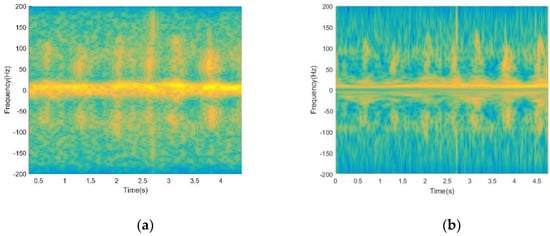 (a) Time-frequency distribution of the raw signal before using Empirical Mode Decomposition (EMD) processing; (b) time-frequency distribution of the raw signal after using EMD processing.