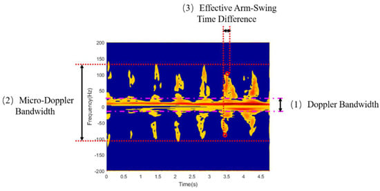 After Energy Aggregation, we extract three features in the time-frequency distribution, i.e., Doppler Bandwidth, Micro-Doppler Bandwidth, and Effective Arm-Swing Time Difference. The Doppler bandwidth reflects the change in trunk velocity during human motion. The micro-Doppler bandwidth reflects the swinging speed of the arm and the swinging amplitude of the arm during the entire movement. The effective arm-swing time difference reflects the number of swinging arms. As shown in Figure 6, the time-frequency signals are divided by energy gradients. From that we can directly get the Doppler bandwidth and micro-Doppler bandwidth. Then, we extract the peak point of the swing-arm and use the swing-arm matching to obtain the corresponding time and get the effective arm swing time difference. The three features can be summarized as follows: