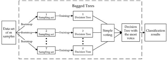 First, given a data set containing m samples, we randomly take a sample from the data set into the sampling set and put the sample back into the initial data set. After randomly sampling m times, we obtain a sample set containing m samples. Then, we repeat the above steps T times, and we obtain T sampling sets, with each sampling set containing m samples. Finally, we train the decision tree based on each sample set to obtain T different decision trees, and then use the simple voting method to obtain the decision tree with the highest number of votes. The classification result produced by the decision tree with the highest number of votes is used as the result of Bagged Trees. The flow chart is shown in the Figure 7.