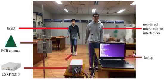 The measurement of the data is performed in an indoor environment with the following configuration. The transmitting and receiving antennas are placed under the same vertical plane. The distance between the two PCB antennas is about 10 cm and 1.2 m from the ground. In order to reduce the multipath effect, we place the PCB antenna in the middle position and the target human body moves radially toward the antenna. The range of the measurement is between 0 and 5 m. Non-target human bodies are located 1.5 m away from the antenna and 0.5 m away from the target human. The specific experimental scene is shown in Figure 8. Each acquisition process is 15 s, which is divided into three 5-seconds segments. The first 5 s is static, the middle 5 s is the effective signal of the target human motion, and in the last 5 s the target human body remains in motion. We select the middle 5 s as the valid data segment.