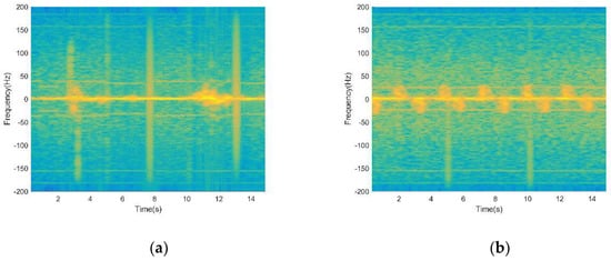 (a) Time-frequency distribution of non-target sudden interference; (b) Time-frequency distribution of non-target continuous swing arm interference.