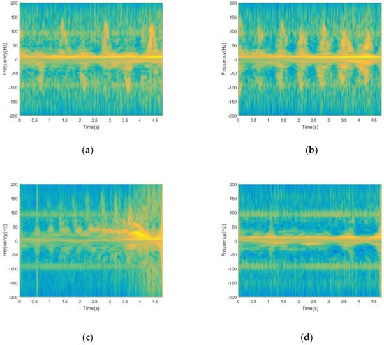 (a) Time-frequency distribution of walking with one arm swinging. (b) Time-frequency distribution of walking with both arms swinging; (c) Time-frequency distribution of running. (d) Time-frequency distribution of walking without either arm swinging.
