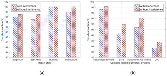 (a) Comparison of classification rate of the proposed system with or without interference; (b) comparison of classification rate of different systems with or without interference.