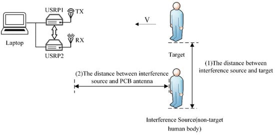 Human motion can cause frequency shift of a radar echo signal, and then produce corresponding Doppler signatures. Thus, Doppler radars can be used to detect human motion. Chen et al. [] proposed the concept that an object or any structures on the object may have mechanical vibrations or rotations, called micro-motion dynamics. Micro-motion dynamics may induce additional frequency modulations on the returned radar signal, which generate sidebands about the target’s Doppler frequency, called the micro-Doppler effect. A micro-Doppler signal can be regarded as a unique signature of a motion aroused by the human body. Therefore, it can be applied to human motion classification [,,,,,,,]. However, as the complexity of the applied environment increases, non-target (i.e., not the target human body) micro-motion interference may appear. Such an interference signal can alias with the signal of the target human motion, and then generate cross-terms, which means the collected signals cannot reflect the real body motion of the target human. Then, systems applied in such scenarios would be much more complex than those for single human body scenarios without any micro-motion interference.