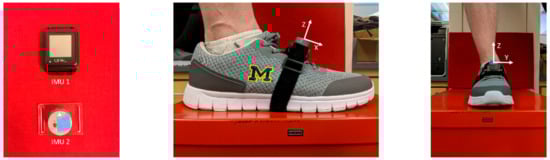 Six healthy subjects (3 female, 3 male; mean (standard deviation) age 24.2 (±6.0) years, height 1.71 (±0.12) m, mass 68.4 (±15.2) kg) were recruited for this study. All subjects verified that they felt capable of completing the experimental protocol. Informed consent was obtained from all subjects and the study was approved by the University of Michigan IRB. Two IMU designs were employed. The first (IMU 1) provides a high accelerometer range and the second (IMU 2) provides a high sampling frequency as reported by the IMU specifications in Table 1. Each subject wore both IMUs strapped together and placed on the bridge of both feet as shown in Figure 1 (only right foot shown) and secured with a strap and tape to limit their movement with respect to each other and to the foot.