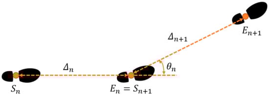 Illustration of stride length , and stride angle, . Orange dots on footprints represent consecutive zero-velocity times.