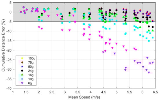 Effect of accelerometer range and mean running speed on the cumulative distance error. Note that errors arising from the 100, 75, and 50 g accelerometers are indistinguishable on this scale. The shaded region indicates estimates within ±5% error.