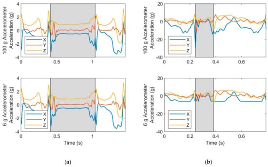 Effect of accelerometer range limits on acceleration data for a sample (a) walking trial (mean speed 1.4 m/s) and a sample (b) running trial (mean speed 5.8 m/s). Acceleration data is saturated when the slope is zero as is most apparent for the X-axis acceleration of the 6 g accelerometer for the running trial. Shaded areas indicate stance phase.