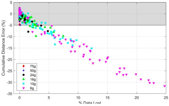 We note that the presence of saturation does not necessarily lead to poor estimates. In particular, acceptable results may still be obtainable if the amount of data that is lost due to saturation remains small. To illustrate what might be “acceptable” levels of saturation for the accelerometer range, we further quantified the amount of data that is lost due to saturation for each trial and accelerometer range and present the relationship of the cumulative distance error and amount of data lost due to saturation in Figure 5. These results show that the cumulative distance errors remain below 5% when the percentage of acceleration data lost due to saturation is below 1.5%, irrespective of the accelerometer range.