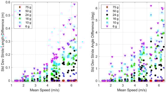 Dependence of the standard deviation of difference in (a) stride length and (b) stride angle estimates with mean speed and accelerometer range. The differences are computed with respect to the results of the 100 g accelerometer as the benchmark.