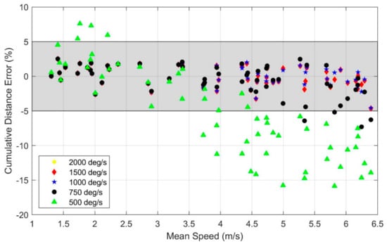 The statistical analysis (Table A2 of Appendix A) reveals a significant effect of speed on cumulative distance error (p < 0.01) with the 2000 deg/s gyroscope range despite no observed accelerometer or gyro signal saturation in any of the trials with this range. Additionally, the statistical analysis reveals that using a gyro range of 750 deg/s or below leads to significantly greater degradation of the estimated distance traveled with speed (p < 0.05 for 750 deg/s, p < 0.001 for 500 deg/s) versus the 2000 deg/s range. Gyro ranges of 1500 deg/s and 1000 deg/s reveal no statistically significant effects compared to 2000 deg/s. These findings are observable in Figure 7 which illustrates the cumulative distance error versus mean running speed for the five gyro ranges considered utilizing data from IMU 1. Because the angular velocities rarely exceeded 1000 deg/s, the distance error is nearly the same for the 2000, 1500, and 1000 deg/s range gyros. The distance errors remain within 5% for all gyro ranges of at least 1000 deg/s for the entire range of mean speeds studied herein (up to 6.4 m/s).