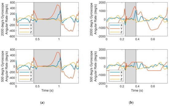 Effect of gyro range limits on angular velocity for a sample (a) walking trial (mean speed 1.4 m/s) and a sample (b) running trial (mean speed 5.8 m/s). Angular velocity data is saturated when the slope is zero as is most apparent for the Y-axis angular velocity of the 500 deg/s gyro for the running trial. Shaded areas indicate stance phases.