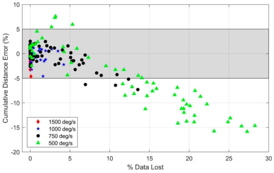 As with the accelerometer, we note that the presence of saturation in the gyro does not necessarily lead to poor estimates; in particular, acceptable results may still be obtainable if the amount of data that is lost due to saturation remains small. To illustrate what might be “acceptable” levels of saturation for gyro signals, we further quantify the amount of data that is lost due to saturation for each trial and gyro range and present the relationship of cumulative distance error and amount of data lost due to saturation in Figure 9. These results show that cumulative distance errors remain below 5% when the percentage of angular velocity data lost due to saturation is below 2.6%, regardless of the gyro range.