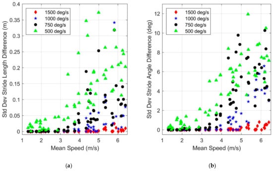 Dependence of the standard deviation of the difference in (a) stride length and (b) stride angle estimates with mean speed and gyro range. The differences are computed with respect to the results of the 2000 deg/s gyro as the benchmark.
