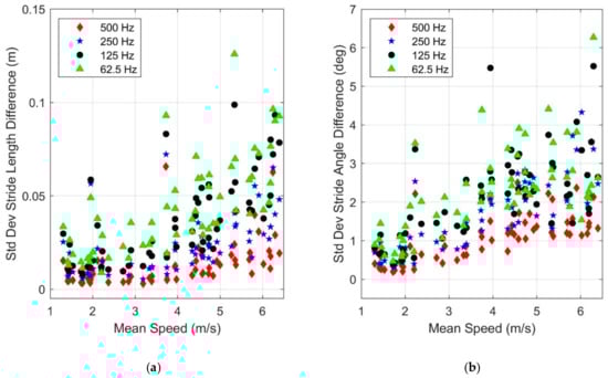 Method 1 constitutes simple down-sampling performed without filtering (e.g., when down-sampling from 1000 to 500 Hz, every other sample is retained). This overly simplistic approach introduces aliasing effects and hence sub-optimal results [,]. Figure 11 illustrates the standard deviation of differences in stride length (Figure 11a) and stride angle (Figure 11b) estimates using Method 1 as functions of both mean speed and sampling frequency. The differences are with respect to the same quantities computed using the original data (i.e., data sampled at 1000 Hz). The standard deviation of the difference from simple down-sampling quickly grows (i.e., increasing variation) with increasing mean speed and decreasing sampling frequency. For example, at the lowest sampling frequency (62.5 Hz), the standard deviation in stride length difference becomes a significant fraction of the stride length at higher mean speeds. Thus, the reliability of these measures is significantly impacted by both mean speed and sampling frequency.
