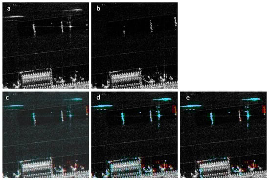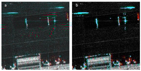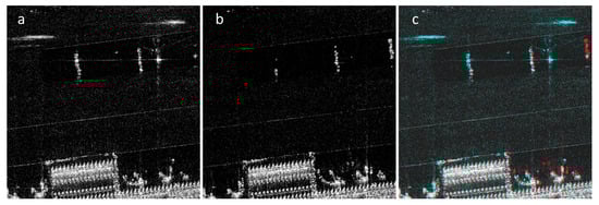 One important use of synthetic aperture radar (SAR) imagery is in detecting changes between datasets from different imaging passes. Target and coherent change detection in SAR images have been extensively researched [,,,]. In two-color multiview (2CMV) advanced geospatial information (AGI) products, the changes are colorized and overlaid on an initial image such that new features are represented in cyan, and features that have disappeared are represented in red. In order to create the change maps, images are cross-correlated pixel-by-pixel to detect the changes. 2CMV products show changes at the pixel level and are often misleadingly dominated with red and cyan colors. Figure 1 shows a portion of a sample 2CMV image. In the sample images, there is an airplane visibly parked next to a building near the bottom center. It can be seen that many of the pixels in the 2CMV image are colored either red or cyan even if there is no change in the area.