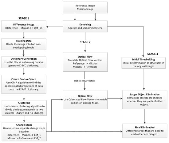 In this section, we describe the image processing approach for extracting change maps. The inputs are two registered SAR images of the same field of view that were taken at different times, i.e., “reference” image and “mission” image. Due to the large size of the images, images were divided into subimages for processing.