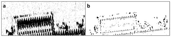 Figure 4 displays a 2CMV image after the first stage wherein it is clear that additional processing is needed to improve results because the ridges of the building in both images are slightly misregistered and they are shown as changes in both images. The primary improvement that is targeted with additional processing is reducing the number of false positives in the image. This goal can be accomplished with the use of the optical flow (OF) method described in Section 2.4. To manage computational complexity, the optical flow algorithm is performed on 256 × 256 pixel image blocks. Note that optical flow is calculated based on the original reference and mission images.