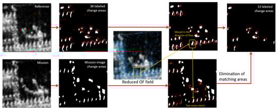 Elimination of false positives using optical flow. Change areas are moved along the flow direction in the reference image change map. Moved areas (shown in red) from the reference image are overlaid onto the mission image change map. The overlapped areas are then removed.