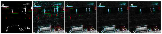 After this process, the labeled areas in the change maps are overlaid on the reference image and checked whether they are a part of a larger object in the image. If the labeled area is found to be a part of a larger object, then the same location in the mission image is checked for the same object. In the case of two similar objects around the same location, it can be assumed that the detected object is a false negative and excluded from the difference map. After these two methods are performed, the output of this stage is generated by simply taking the intersection of the two results. Figure 6 shows how this process converts the reference image in (a) to the final output in (e).