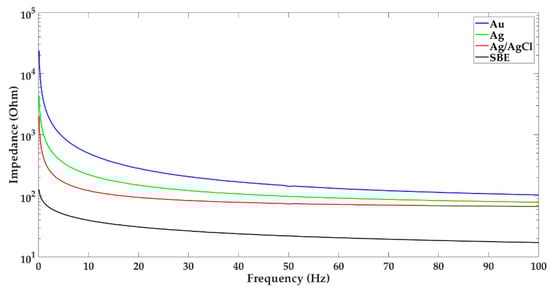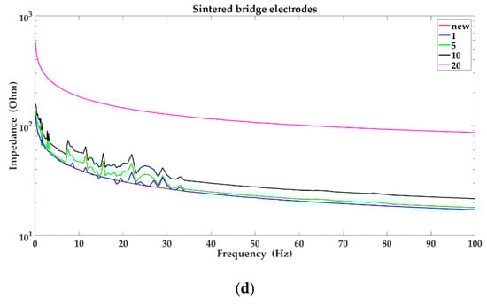 The presented results confirm the generally known fact that the impedance decreases with increasing frequency []. However, the sintered bridge electrodes are characterized by the smallest impedance in the entire EEG frequency range in contrast to the gold electrodes, whose impedance is the largest. It is worth adding that none of new, tested electrodes in the range of slow waves has obtained a linear characteristic.