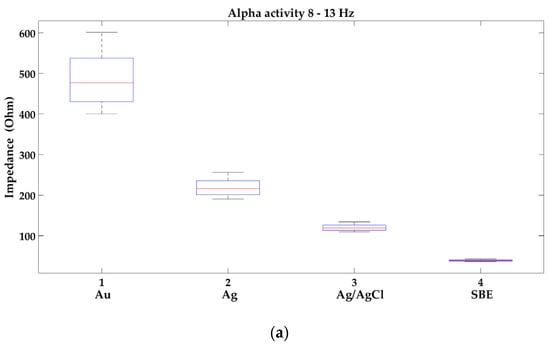 In some cases, i.e., when brain death should be confirmed by EEG examination, it is recommended to obtain not only a scalp–electrode impedance below 5 kΩ but also its equal value for individual electrodes used in the study []. In no-clinical applications, e.g., adaptive automation, affective computing, or video games where the human psychophysiological state evaluation is measured by means of EEG equipment [,,,], the problem with obtaining the same value of impedance for electrodes especially in theta and alpha brain activities should be important as well. The usage of reusable electrodes for measurement of chosen EEG features defining the actual user’s mental status [,,], i.e., ratio of rhythms beta/(alpha + theta), beta/alpha, event related potential, evoked potentials, or the frontal EEG asymmetry may affect the correctness of implementation of all passive brain–computer interface (pBCI) applications. The maintenance of a correct and equal value of the scalp–electrode impedance can be influenced not only by the patient’s preparation for the examination, the skin properties of the subject, and the number of EEG examinations performed with a given set of electrodes but also the variability of impedance values of individual electrodes in one set. The tests carried out with the use of EIS revealed the variability of the impedance in each group of electrodes being tested, i.e., gold, silver, silver/silver chloride, and the sintered bridge electrodes. It is worth noting that the tested electrodes have not been unused. In case of recommended silver/silver chloride electrodes, the largest spread of impedance was observed in range of beta waves, while in range of delta activity, despite small dispersion, outliers appeared. In turn, the gold electrodes achieved the highest impedance and the greatest variability in the entire EEG frequency range.