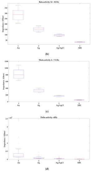 Analysis of the variability of impedance of new electrodes in the following brain activities: (a) alpha 8–13 Hz; (b) beta 14–30 Hz; (c) theta 4–7.5 Hz; (d) delta 0.1–3.5 Hz; where: 1-gold (Au), 2-silver (Ag), 3-silver/silver chloride (Ag/AgCl) and 4-sintered bridge electrodes (SBE). Within the box, a horizontal red line means the median value of the data set, whereas the bottom and top blue lines of the box indicate the 25th and 75th percentiles, the whiskers present min and max, and the outliers are marked with the ‘+’ symbol.