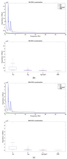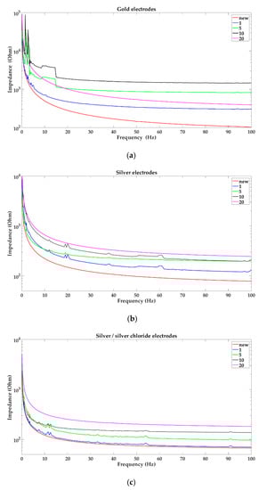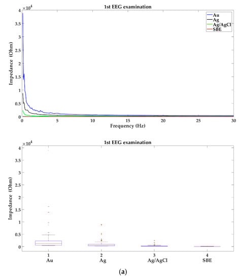 Based on the results presented in Figure 4 and Figure 5, it can be concluded that impedance value and variability of impedance depend on the number of performed EEG examinations. In case of the sintered bridge electrodes, impedance increased with an increase in the number of performed EEG examinations. A similar effect was observed with silver and silver/silver chloride electrodes where the impedance has increased successively after the first, the fifth, the tenth, and the twentieth EEG examinations. For gold electrodes, impedance has increased successively after the first, the fifth, and the tenth EEG examinations. However, after the twentieth EEG examination the impedance approached characteristics corresponding to the first use. Moreover, the variability of impedance increased with a rise in the number of performed EEG examinations for all types of electrodes.