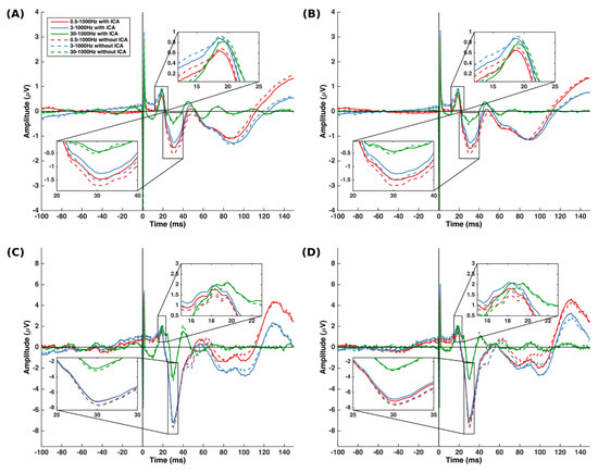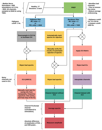 Therefore, the objective of this study was to investigate the effects of the class of filter used, the cutoff frequencies, and the use of independent component analysis (ICA) on the amplitudes of SEPs evoked by stimulating the median nerve. For this purpose, we used two classes of filters, Kaiser-windowed (FIR) and Butterworth (IIR), with three bandpass frequencies: 0.5–1000 Hz, 3–1000 Hz, and 30–1000 Hz, processed with or without ICA, which was used to remove non-brain components from the data. The choice of filters and cutoff frequencies is based on the previous usage and recommendations of analyzing ERP and SEP data obtained from the literature search.