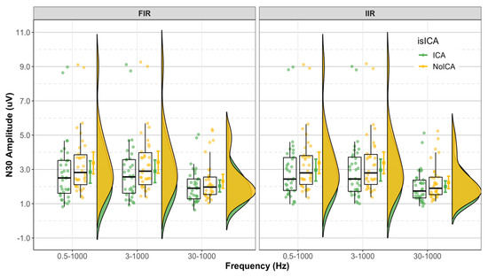 The IIR (Butterworth) filtered EEG showed a similar N30 amplitude compared to FIR (Kaiser window) filtered EEG, irrespective of the cutoff frequencies and the use of ICA to remove non-brain components from the data.