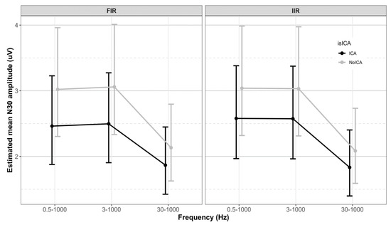 There were statistically no significant differences between N30 amplitudes filtered with FIR or IIR, irrespective of the cutoff frequencies and use of ICA. Figure 4 shows the effect of filter class on N30 amplitude, and contrasts are given in Table 4.