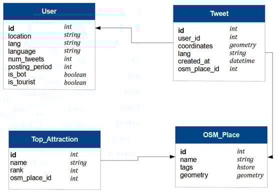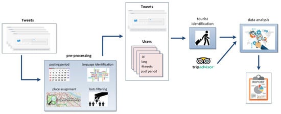 Figure 1 outlines the components and procedures of the system that implements our solution scheme. We use three data sources, namely Twitter, OpenStreetMap (OSM) and TripAdvisor that appear at different stages of the process. Tweets collected for two cities, Valencia and Berlin, for the period 2015–2018 were downloaded and stored in a database. Prior to the tourist identification, some data cleansing to eliminate bots from the Twitter dataset and transformation operations to derive new attributes are applied. Thus, we associate each tweet to a geo-located place in OSM through the tweet coordinates, we calculate the period of message posting for the users identified in the Twitter dataset and we estimate the language of the users based on the language specified in their Twitter accounts and the language of the posted tweets. As a result of this data pre-processing, we end up with a collection of significant tweets and associated users.
