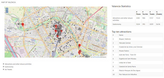 Figure 9 shows that tweets are mostly located around the top 10 sites in the city of Valencia. Other popular parts of the city, such as the area around the beach, concentrate a lower number of tweets and so it does not rank in the top 10 sites of the city. Overall, we can observe in Figure 9 that about 72% of all the tweets posted from any attraction of the city correspond to the top 10 attractions, which is a fairly high value. The remaining 28% is the tweets sent by visitors from attractions which are not ranked within the top 10 sites of the city. The proportion of tweets posted from the gastronomy places associated with the top attractions with respect to all gastronomy-related tweets in the city is relatively lower.