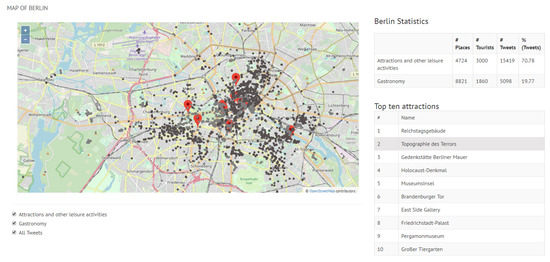 With respect to Berlin, Figure 10 shows that tweets are geographically spread in a larger area of the city in comparison to Valencia, meaning that a significant number of tweets of both categories (attractions and gastronomy) is found outside or far away from the area around the top 10 attractions. This aspect is clearly more pronounced in the gastronomy places of Berlin, which reveals that visitors prefer to choose a restaurants other than the ones located around the top attractions. This is an interesting finding that might be helpful to develop the gastronomy infrastructure of some areas of the city.