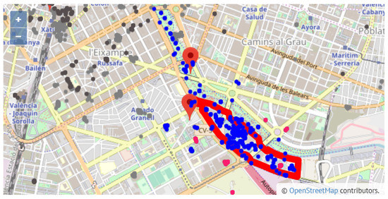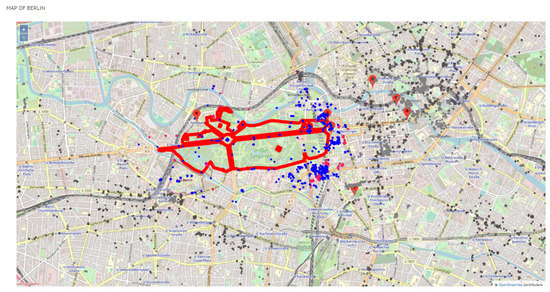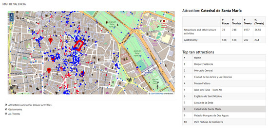Figure 11 is the view that our tool displays when a specific site is selected—for example, the “Catedral de Santa Maria” (site 8). The map highlights the site polygon and the tweets of both categories posted within a radius of 500 m from the site (blue points for attractions and pink points for gastronomy). The statistical values on the right side of the figure indicate the number of places of each category around the cathedral (#Places), the number of tourists who have posted a tweet from one of these places—including the cathedral itself (#Tourists)—and the number of tweets (#Tweets). The column (%Tweets) is the percentage of tweets posted from the site “Catedral de Santa Maria” with respect to the total number of tweets sent from all the sites of Valencia that belong to the same category as “Catedral de Santa Maria”, i.e., Attractions and other leisure activities, and the tweets sent from gastronomy places around this site with respect to all gastronomy-related tweets in the city. Henceforth, we will not show the statistics on the maps in order to provide a closer view of the tweets location; statistics of the top 10 sites of Valencia and Berlin can be consulted in Table 7 and Table 8, respectively.