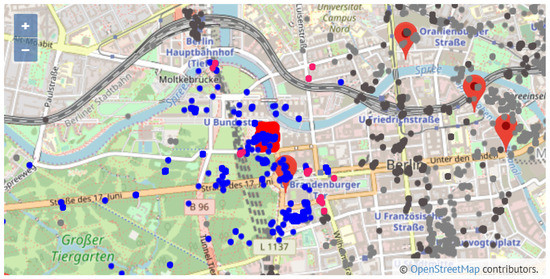 In the case of Berlin, the most visited places are sites 1, 5, 6, 9 and 10 (see Table 8). Figure 13 shows a zoomed in view of site 10, which stands over the rest of the sites with 33.16% of the attraction tweets. Site 3 (’Gedenkstätte Berliner Mau’ or Berlin Wall Memorial) shows a behaviour similar to sites 1 and 3 in Valencia; that is, it is a remotely located attraction, far away from the rest of attractions that however concentrates a high percentage of the tweets of the surrounding area. On the other hand, sites 1 and 6, with almost 20% of the attraction tweets, only receive 1.03% and 0.94% of the gastronomy tweets. This indicates the tourist interest of these two attractions but also the lack of an adequate gastronomic offer in either the number or the quality of the restaurants around. Particularly, the few gastronomy places (pink points) around site 1 (’Reichstagsgebäude’) are displayed in the zoomed in plot of Figure 14. Site 2 is the spot with the lowest number of restaurants and food places in the surrounding area (only 3); however, in comparison with other top 10 sites, it gathers a significant number of tweets and tourists from these restaurants.