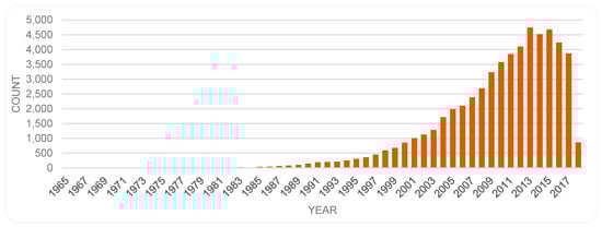 The number of publications on a topic represents the volume of scientific output. As discussed by other researchers, scientific publishing is growing in general and at slightly varying rates in different fields (e.g., [,]). When it comes to publications on biosensors, the number has increased over the years, from just a handful over the first two decades, to well over 3000 items per year since 2009 (c.f. [] regarding the number of patents; or c.f. publication trends in []). As mentioned, the main data for this study was retrieved in March 2018 from the PubMed database. That dataset suggests a decline in the number of publications on biosensors in the more recent years, with a peak in 2013 with 4729 items, as shown in Figure 1.