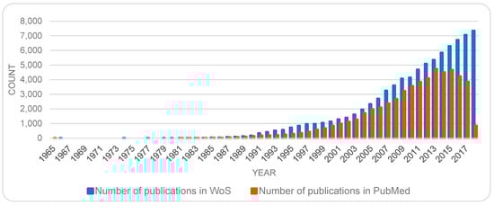Meanwhile, although this study is mainly based on data retrieved from the PubMed database in 2018, for an up-to-date overview of the trends, additional new data (8 May 2019) was captured from the WoS database. Figure 2 depicts the trends based on this new set of data. (The trend from the original PubMed data is also included as a point of reference.)