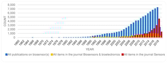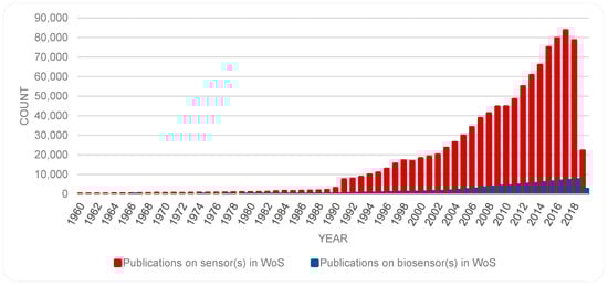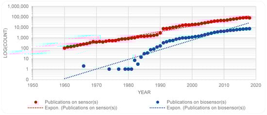 Another topic with close affinity with biosensor(s) is that of sensor(s). Further new data (from WoS on 8 May 2019) was captured regarding the number of publications on the topic of sensor(s) which resulted to 1,039,670 items. The growth of the number of publications on both topics is illustrated in Figure 4.