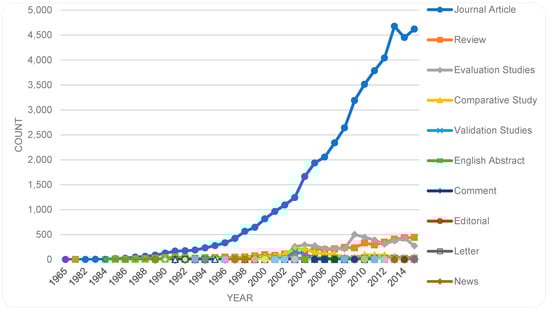 We separated any types of research support (43,221), from our main findings and examined separately. Since a publication can be assigned multiple types, all publication types besides research support were identified and their trends illustrated in Figure 6. As shown, Journal Article is the publication type most occurring (46,414), whether in the first or in alternative positions. In the remaining 12,849 items, the top five publication types are Review (4382 items), Evaluation studies (4311 items), Comparative study (1771 items), Validation studies (532 items), and English abstract (523 items), with the remaining 40 types each occurring in smaller numbers.