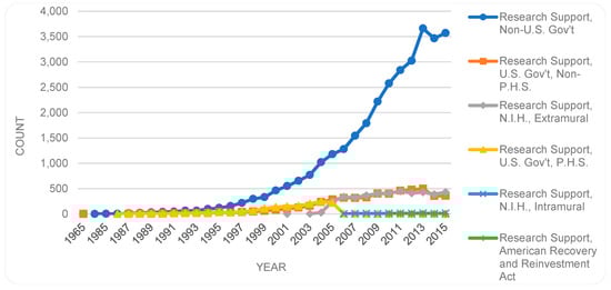 Figure 7 illustrates the research support types, which are included as acknowledgment of a support (e.g., funding) from a particular institute. As indicated, research support is mostly from ‘non-U.S. government’ sources. As shown, in Figure 6 and Figure 7, a somewhat similar developmental curvature exists for the top publication type (Journal Article) and the top research support type (Research Support, Non-U.S. Gov’t).