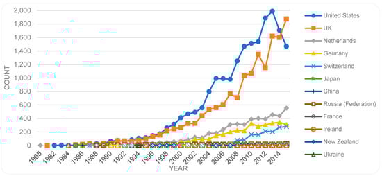 For a study of the countries, one can extract country information from the field place of publication. This provides information about the countries in which different papers are published. If one is interested in the countries in which the research has been conducted, the situation becomes more complex. Should one examine the nationality of the authors, the country of the funding organization, or the country of author affiliation? It is most common to go by the latter. However, some complications remain since at times an author may have multiple affiliations, (raising the question about which country to include) or in some cases, the affiliation information is fully or partially missing, for one or more of the authors. Furthermore, when a paper is co-authored some choose to look at the first author, while others choose to use a fractionalized counting where the credit is subdivided equally among all the countries involved. That is, for a paper that has five authors from five different countries, the country of each author would be assigned a value of 1/5th. Even this is problematic, since this treatment assumes equal contribution by all authors which is not always the case. We chose to examine the countries in two ways: the country information extracted from (a) the fields PL—Place of Publication (i.e., the country of the source), and (b) AD—Affiliation (i.e., the countries of authors), however, only the country of the first author. The reason behind this choice was two folded. The first authors typically act as the driver of the publication. More importantly, we made this choice in order to be consistent in the application of the chosen method for the whole period included in the dataset. In PubMed, only the affiliation of the first author is included prior to 2014 (Please see: https://www.ncbi.nlm.nih.gov/books/NBK3827/: “Multiple affiliations were added to citations starting from 2014, previously only the first author’s affiliation was included.”).