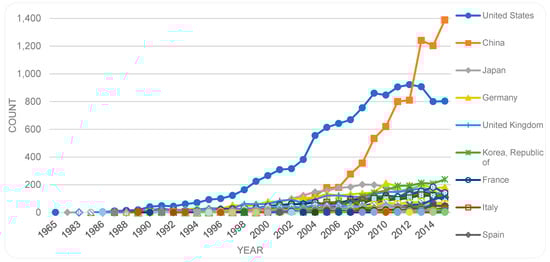 In another paper [], the trends in global environmental monitoring are studied and the most productive countries in that field (by first authors) are identified (with top being US, UK, Italy, China, Germany). Although biosensors are included due to their role in environmental monitoring, they are not the focus of that study. Similarly, biosensors appear in another study [], only as a part of publications on techniques for monitoring water quality and detection of microorganisms and metagenomics. Again, in that study the most productive countries in the field ae identified (e.g., China, 36.7%; US, 21.86%; followed by others each with significantly fewer publications). Two others study a way of identifying ‘reverse salients’ [] and nanobiotechnology as an emerging research domain from nanotechnology []. Again, while insightful, the overview structure of publications on biosensors is not the focus.