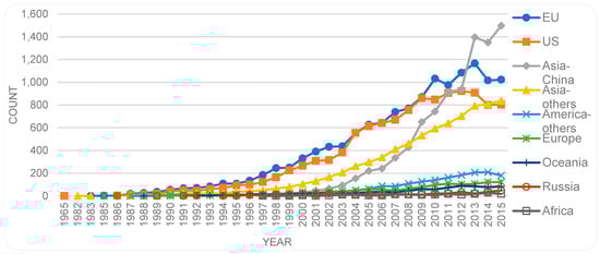 Considering the size of population in different countries, it would be informative to also compare research output by the collective of the EU countries with those of the US and China. To get a sense of this, we grouped the data on the location of the first authors (e.g., European Union or other representative regions). By this grouping, we find that the EU becomes dominant with the majority of publications (in total over time), followed by the US, China, and Asian countries other than China. America-others include Canada, central, and southern American countries and Oceania include Australia and New Zealand. Based on this dataset, the publications by both the EU- and US-based first authors have slowed down from 2014 (Figure 10), but publications by first authors from other Asian countries have gradually increased.
