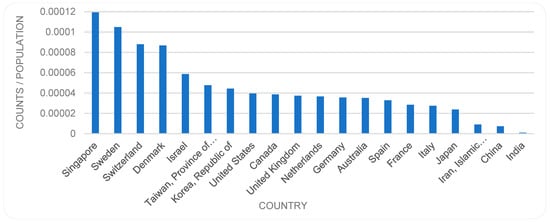 Indeed, consideration of the size of countries or regions and associated population provides further insights. That is, if we divide the number of contributions by the size of population in each country, the level of contributions by each country becomes rather different to the order presented in Figure 9. The publication numbers per capita are presented in Figure 11, placing Singapore as the most productive country (per capita) followed by Sweden, Switzerland and Denmark. The US that topped the order in Figure 9 is now ranked number 8 and China is at position 19. Japan that had appeared in position 3 directly after China, now take the position 17 ahead of China. Even Iran that was not included in Figure 9, is now included ahead of China.