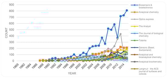 With the growing number of articles that are published on the topic, it is no longer straightforward to build an informed overview of this extended body of publications. In a separate study (not yet published), we have identified over 700 overview articles by experts in the field, which are based on sub-selections of publications. Those overviews provide rich discussions of narrower sub-areas, for example on graphene-based biosensors (e.g., [,], carbon nanotube-based biosensors (e.g., [,]), implantable biosensors (e.g., []), surface plasmon resonance (e.g., [,]), chemical biosensors and application of electrochemistry for sensing (e.g., [,]) and more. However, while these selective sub-area overviews are useful and informative, with rapidly evolving discoveries and inventions in this field, it also becomes relevant to form an understanding of the trends, patterns of growth, and up-to-date overview of the full set of publications. Bibliometric analyses (that focus on related statistical data to inform of new trends) have been shown to be useful for the latter.