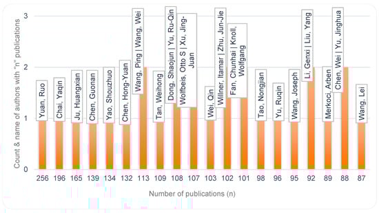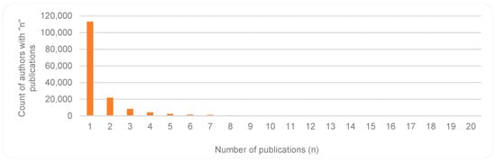 Aligned with Lotka’s law, we found an inverse correlation between authors and number of contributions by each author. At one end of the scale, many authors (112,974) have contributed with only one publication; at the other end of the scale a few authors (For author analyses, care was taken for accuracy, e.g., by using full author names and attention to author id numbers where available. However, not all publications included full names or author identification numbers, and since affiliations may vary over times, they were not always useful in identifying all variations in author names) (18) have contributed to more than 100 publications each. Figure 14 and Figure 15 present the two ends of the spectrum of this reverse relationship. With an average of 5.2 authors per publication, one item has 151 authors [], and there are 1924 items with a single author.