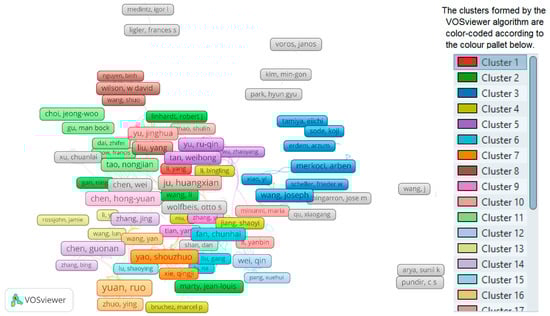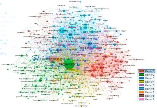 In contrast to the analysis of MeSH terms, in this section, we focus on the Other Terms (or Author Keywords). The same procedure is followed. By setting the threshold of minimum number of occurrences to 5; of 32,087 keywords, 1689 met the threshold and top 500 terms with greatest total link strength were selected. When clustering is done, the landscape looks somewhat different. Here, the terms “biosensor(s)” is the main keyword used by authors rather than “biosensing techniques”. There are now nine clusters formed as presented in Figure 22. With this in mind, the top 20 most frequent terms in each of the nine clusters are presented in Table 8.